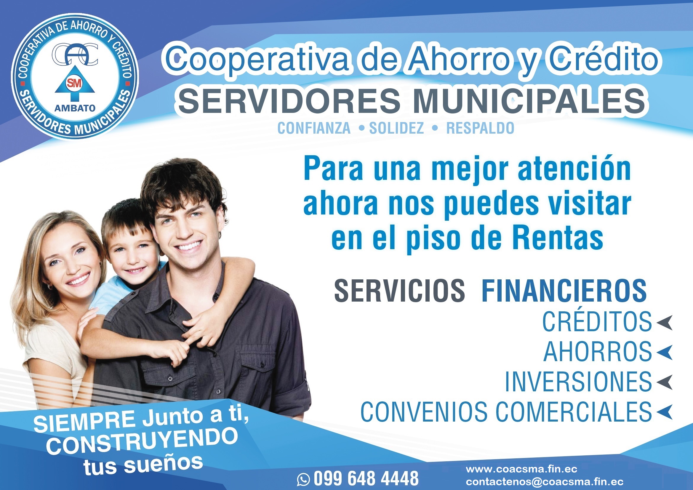 El 04 de abril de 1992, un grupo de empleados de la Ilustre Municipalidad de Ambato, tuvieron la brillante idea de integrarse bajo el amparo de la filosofía cooperativista, cuyo objetivo social era la ayuda mutua y la prestación de servicios solidarios para mejorar las condiciones de su entorno familiar, logrando personería jurídica según acuerdo ministerial el 20 de abril de 1992. Inscritos 53 socios fundadores en el Ministerio de Bienestar Social “COOPERATIVA DE AHORRO Y CREDITO SERVIDORES MUNICPALES DE AMBATO LTDA.”
